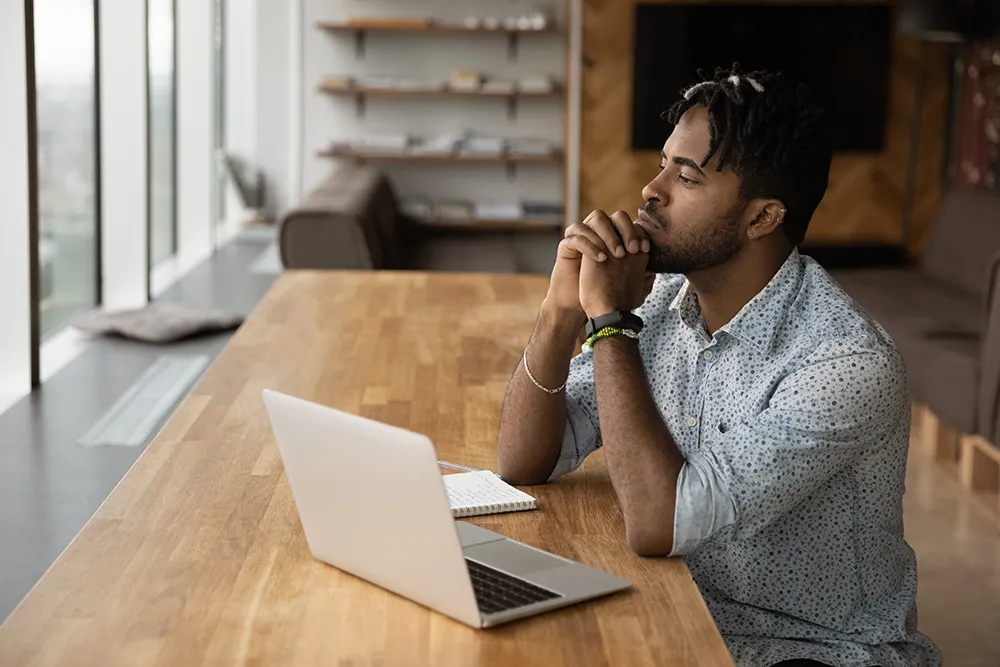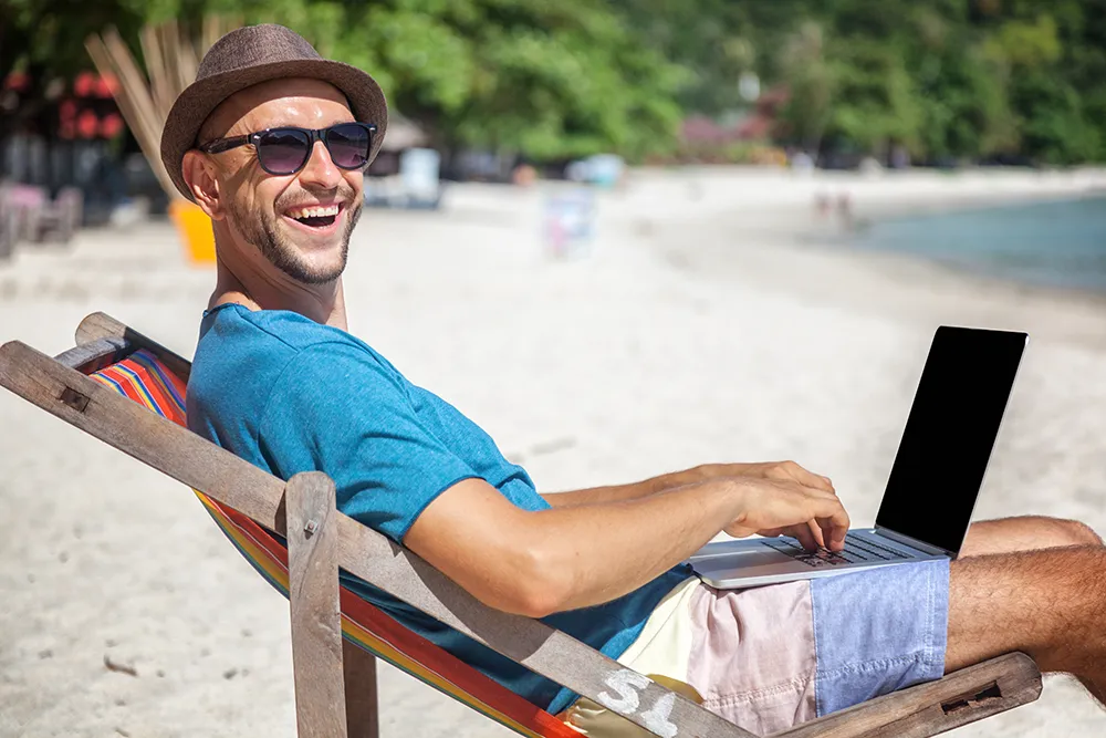 A man works on a laptop at a wooden table overlooking a tropical bay, embracing lifestyle freedom as he manages his small business online, surrounded by work devices and a hat.